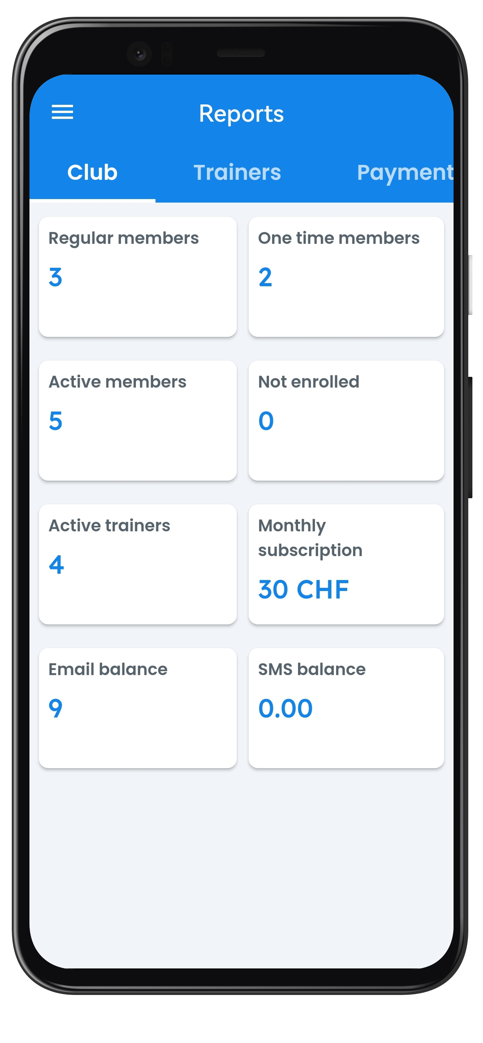 Rich reporting section gives you accurate info on all important data: members count, payments sum, attendance, current recurring income and more.